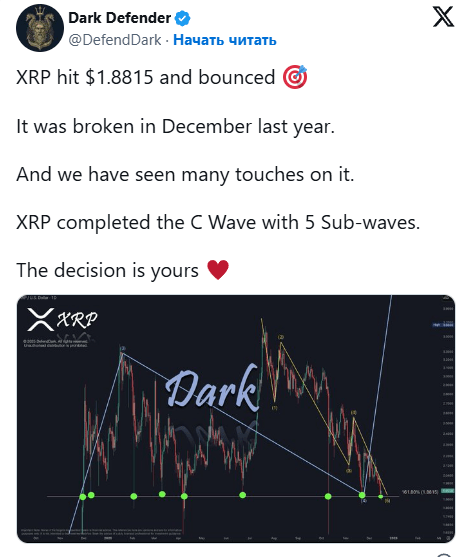 В период заключительного коррекционного этапа волна C достигла отметки $1,88, которую он теперь считает подтверждённым дном месячной структуры волны 4. Аналитик выделил ключевую зону поддержки между $2,22 и $1,88, отметив, что XRP некоторое время торговался в этом диапазоне, прежде чем отскочить вверх.