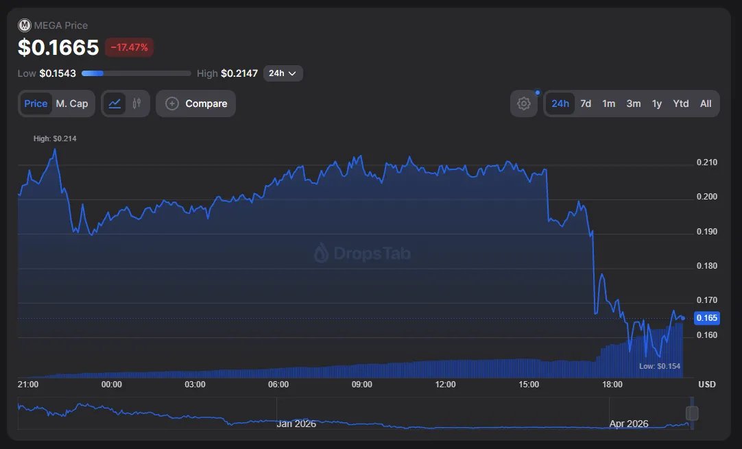 На фоне анонса цена токена MEGA на премаркете упала с $0,2 до $0,16.