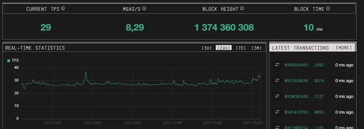 MegaETH позиционируется как «блокчейн реального времени», стремится к пропускной способности в 100 000 TPS и практически мгновенной финализации транзакций. Однако текущие среднесуточные показатели составляют около 30 TPS.