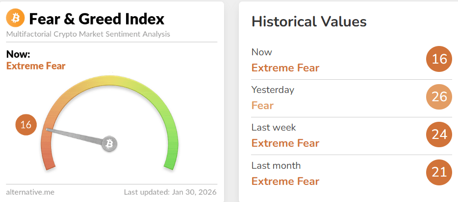 Индекс страха и жадности биткоина остается в красной зоне. Рынком правит страх.