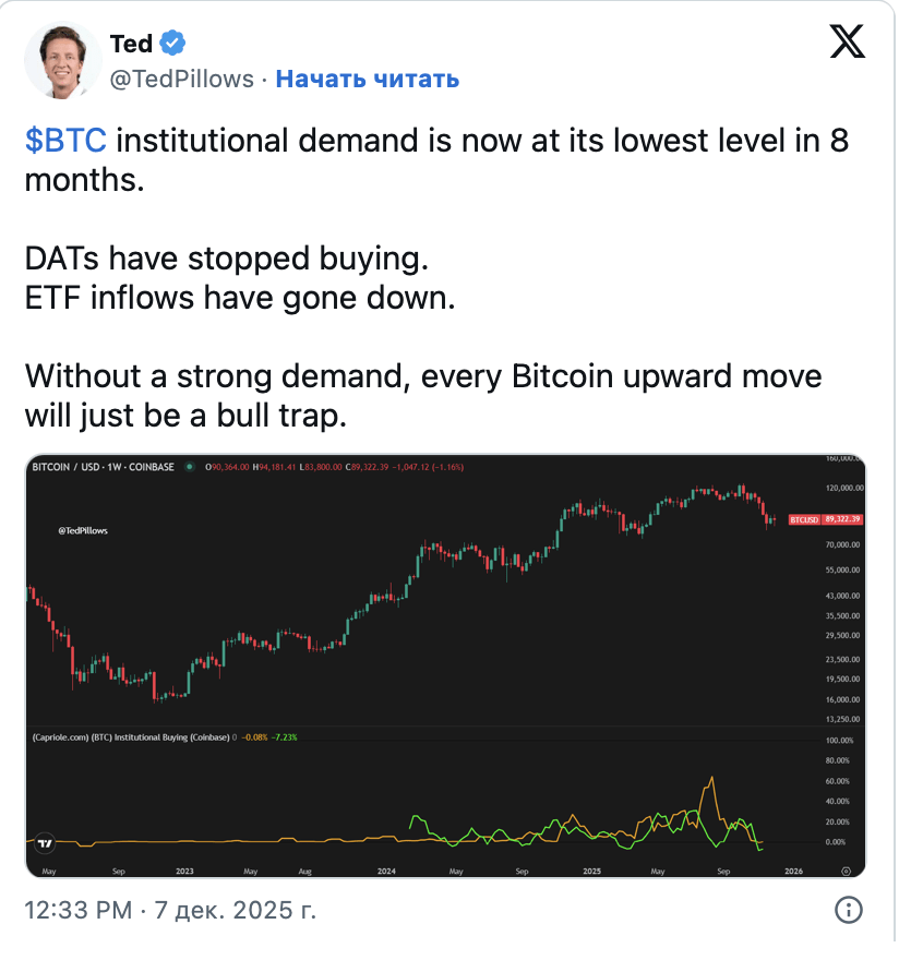 С начала ноября ETF превратились в чистых продавцов криптовалюты. Период агрессивного накопления сменился стагнацией, а затем и планомерным выводом средств. Отсутствие новых покупателей создает избыточное давление на торговые площадки.
